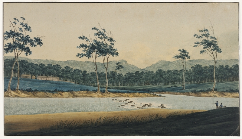 Richard Neville considers the picture very unusual in that it focuses on a pure, unimproved landscape. He explains; ‘Nearly all colonial landscapes of this period concentrate on landscapes improved or enhanced by progress and agriculture – this watercolour on the other hand, is a well-constructed, well-resolved image of a wild landscape, inhabited only by two small Aboriginal figures, themselves signifiers of wilderness.’
