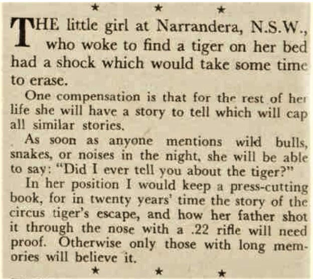 It didn’t take long to establish that the tiger was an escapee from Bullen’s circus, which was camped about half a mile from the Hallcroft home. The circus had performed to a full house at Narrandera the previous night.