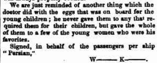 Mr Loch, after a careful investigation of the whole case. considers the “Persian” to have been improperly ventilated, ill-found in wholesome provisions and medical comforts, and deficient in accommodation for cooking and baking; and worst of all, that the health, and as it proved, the lives of the Emigrants were entrusted to a ‘manifestly incompetent medical man, and he [Mr Loch] very much regrets that those who sanctioned the appointment of Mr Gray to such a charge cannot be visited with a suitable penalty. (Tasmanian Daily) Jan 13 1858)